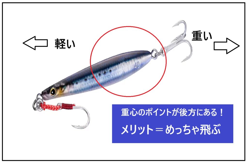 リアバランスのメタルジグは、尻尾に重心があり細身のタイプが多いです。