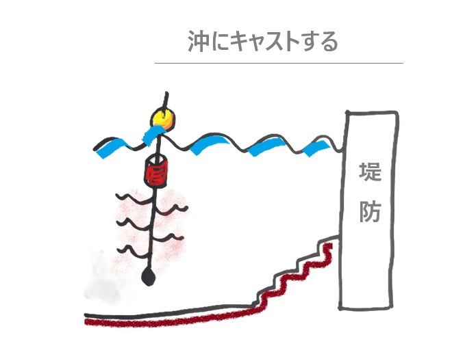 投げサビキ仕掛けとは、堤防の足元の魚を釣るのではなく、投げてちょっと沖の魚を釣るのが最大の特徴です。
