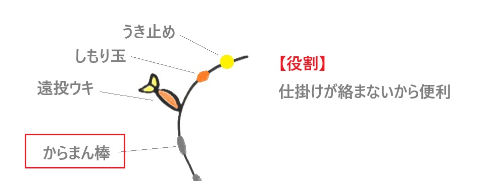 ウキの全長が10㎝なら、からまん棒を付ける位置はウキから10~15㎝くらい下になります。